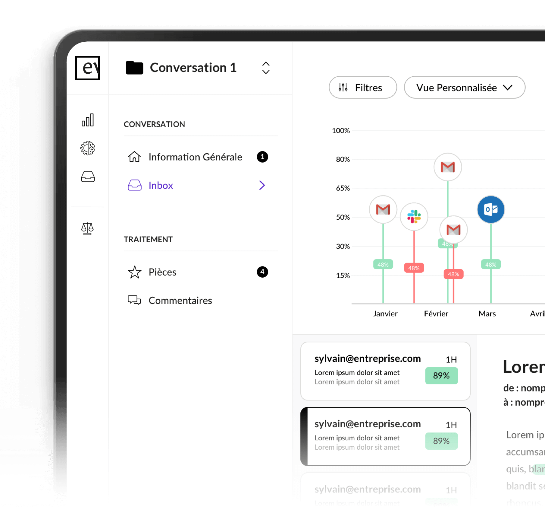 Le filtrage intelligent d’Evidence est conçu pour aider les clients à isoler rapidement les échanges pertinents dans un océan de conversations numériques. Grâce à une IA sémantique et émotionnelle, l’outil analyse les contenus de mails, SMS ou messages Slack pour repérer automatiquement les expressions clés, les interlocuteurs concernés et les signaux de risque juridique.